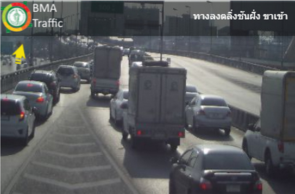 กทม. 23 เม.ย.-สวพ.FM91 รายงานจราจรเช้าวันพฤหัสบดี สภาพการจราจรบนคู่ขนานลอยฟ้าบรมราชชนนี ขาเข้า รถหนาแน่น เคลื่อนตัวได้ช้า ช่วงโค้งสายใต้เก่า ท้ายแถวสะสมเหนือทางรถไฟตลิ่งชัน