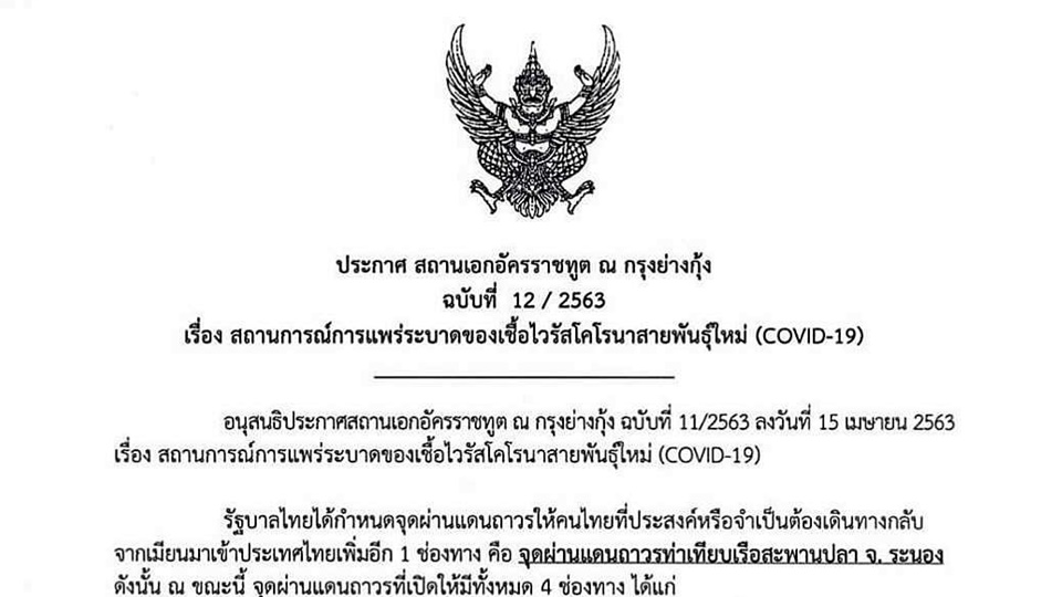 สถานเอกอัครราชทูต ณ กรุงย่างกุ้ง ออกประกาศ เรื่อง รัฐบาลไทยได้กำหนดจุดผ่านแดนถาวรให้คนไทยที่ประสงค์หรือจำเป็นต้องเดินทางกลับจากเมียนมาเข้าประเทศไทย เพิ่มอีก 1 ช่องทาง คือ จุดผ่านแดนถาวรท่าเทียบเรือสะพานปลา จ.ระนอง ตั้งแต่วันที่ 23 เม.ย. 2563