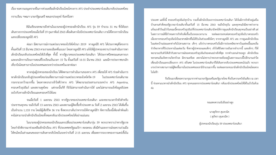 สำนักข่าวไทย 23 เม.ย.-ผู้ปกครองนักเรียนแลกเปลี่ยน AFS ร้องรัฐบาลช่วยเหลือลูกกลับจากอาร์เจนตินา หลังเคยยื่นหนังสือถึงนายกฯไปแล้ว เป็นห่วงความปลอดภัยการแพร่ระบาดของโรคโควิด-19 ซึ่งอาร์เจนตินากำลังเข้าสู่ช่วงหน้าหนาว และไม่มีการรณรงค์สวมหน้ากากอนามัย