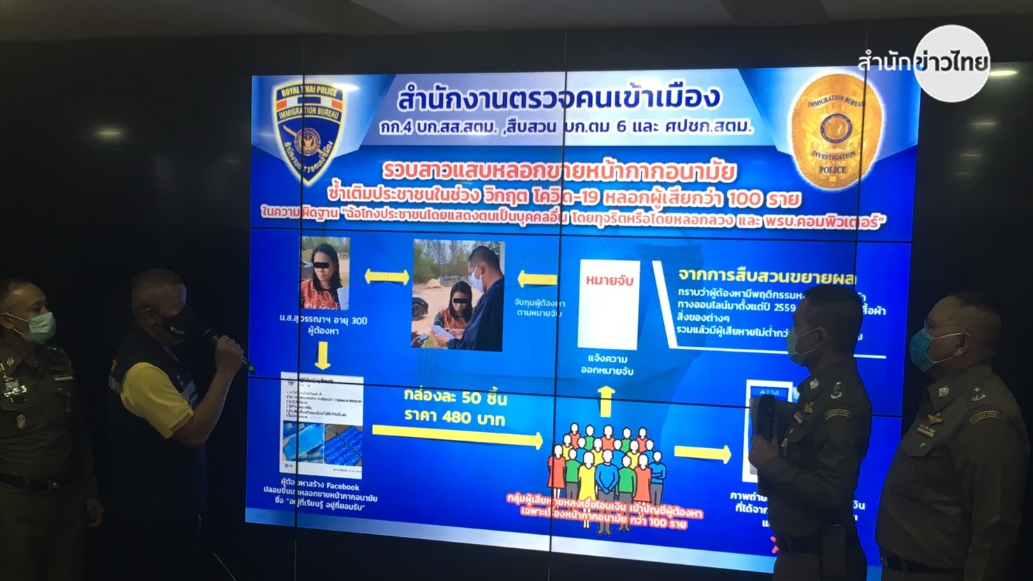 กทม.23 เม.ย.-สตม. จับผู้ต้องหาอ้างเป็นตำรวจหลอกขายหน้ากากอนามัยเสียหาย 1.46 ล้าน พร้อมล่อซื้อขายน้ากากอนามัยเกินราคา