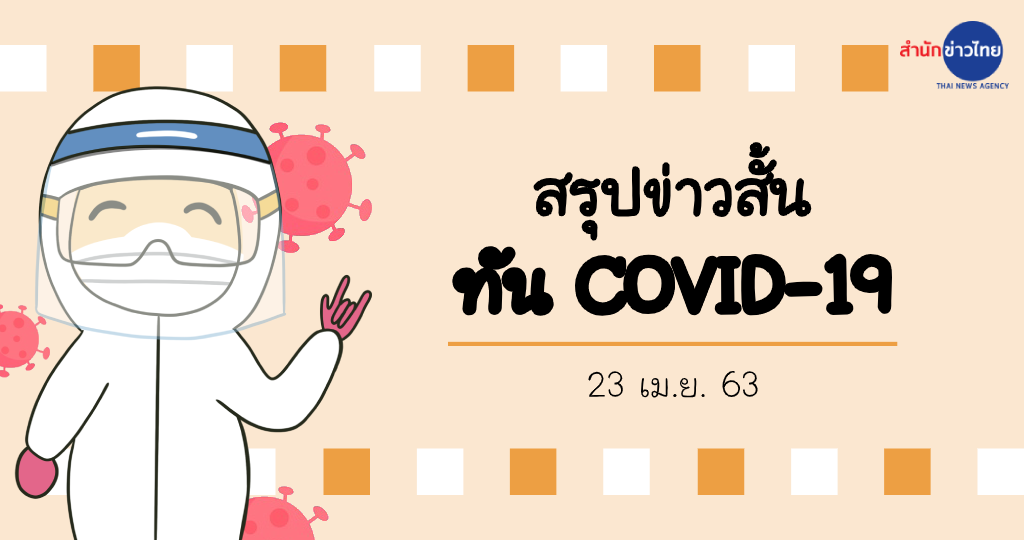 สำนักข่าวไทย 23 เม.ย. 63 – สรุปข่าวสั้น ทันโควิด-19 วันนี้ สถานการณ์โรคโควิด-19 ในไทย พบผู้ป่วยรายใหม่ 13 ราย สะสม 2,839 ราย ตายเพิ่มอีก 1 ราย มีโรคประจำตัว โฆษก ศบค. ย้ำ เปรียบเป็นมวย เรายังอยู่แค่ยกที่ 4 ต้องลุ้นกันไปอีกยาว การ์ดอย่าตก