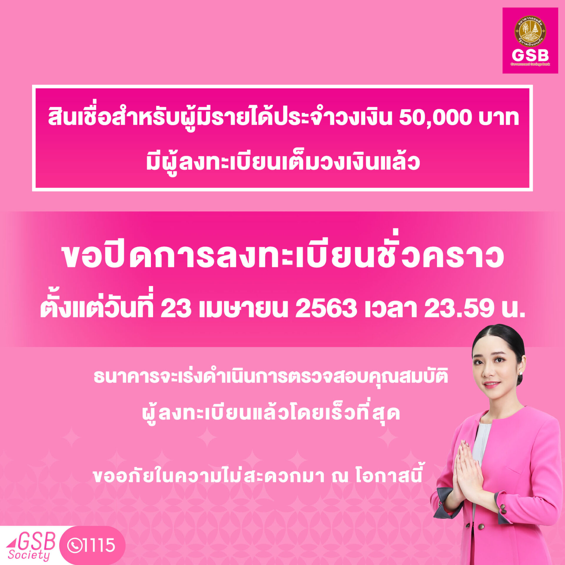 ปรากฏว่า มีผู้สนใจลงทะเบียนยื่นเรื่องขอสินเชื่อทั้ง 2 ประเภทดังกล่าวเป็นจำนวนมาก ในช่วงเวลาเพียงไม่กี่วัน โดยเฉพาะสินเชื่อผู้มีรายได้ประจำ วงเงินกู้ต่อรายไม่เกิน 50,000 บาท ณ วันที่ 23 เมษายน 2563 เวลา 17.00 น. มีผู้ลงทะเบียน รวมทั้งสิ้น 608,956 ราย คิดเป็นวงเงินสินเชื่อประมาณ 30,447.80 ล้านบาท (ถ้าอนุมัติ 50,000 บาท ทุกราย) ซึ่งเกินวงเงิน 20,000 ล้านบาท ที่ ครม.ได้ให้กรอบไว้ ดังนั้น เพื่อให้เป็นไปตามเจตนารมณ์ของโครงการในการให้ความช่วยเหลือลูกค้าและประชาชนอย่างทั่วถึง ธนาคารออมสินจึงขอปิดระบบการลงทะเบียนดังกล่าวชั่วคราว เฉพาะสินเชื่อผู้มีรายได้ประจำ วงเงิน 50,000 บาท เท่านั้น ตั้งแต่วันที่ 23 เมษายน 2563 เวลา 23.59 น. เพื่อเร่งดำเนินการตรวจสอบคุณสมบัติของผู้ที่ลงทะเบียนแล้วให้เร็วที่สุด ซึ่งจะทราบในเบื้องต้นถึงจำนวนเงินที่คาดว่าจะอนุมัติและวงเงินคงเหลือ เพื่อพิจารณาเปิดให้ลงทะเบียนรอบใหม่ต่อไป ทั้งนี้สำหรับสินเชื่อผู้มีอาชีพอิสระ วงเงิน 10,000 บาท ยังสามารถลงทะเบียนได้ตามปกติ