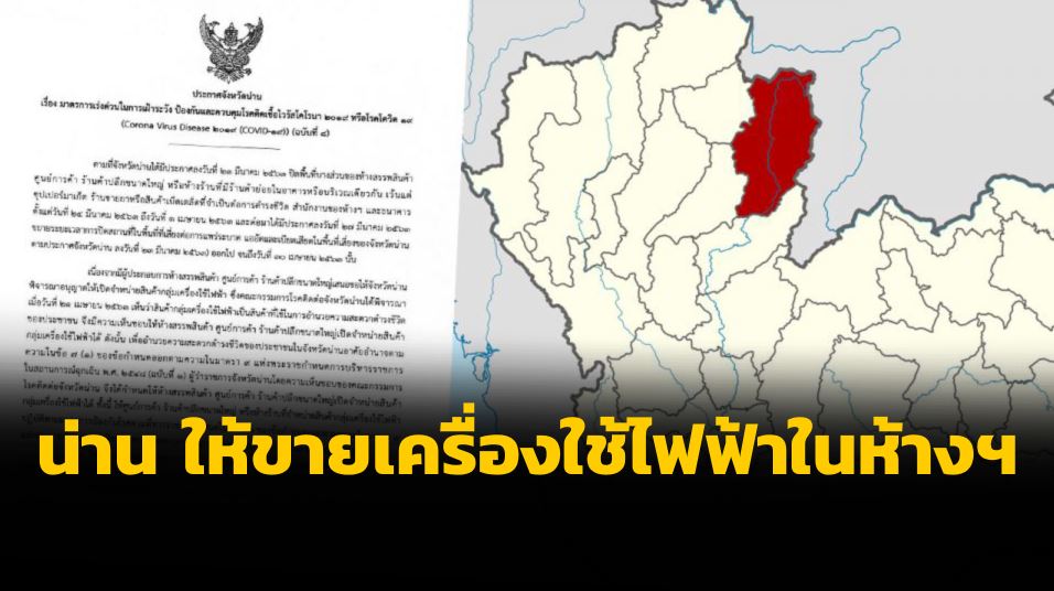 เนื่องจากมีผู้ประกอบการห้างสรรพสินค้า ศูนย์การค้า ร้านค้าปลีกขนาดใหญ่ เสนอขอให้จังหวัดน่านพิจารณาอนุญาตให้เปิดจำหน่ายสินค้ากลุ่มเครื่องใช้ไฟฟ้า ซึ่งคณะกรรมการโรคติดต่อจังหวัดน่าน ได้พิจารณาเมื่อวันที่ 21 เมษายน 2563 เห็นว่าสินค้ากลุ่มเครื่องใช้ไฟฟ้าเป็นสินค้าที่ใช้ในการอำนวยความสะดวกดำรงชีวิตของประชาชน จึงมีความเห็นชอบให้ห้างสรรพสินค้า ศูนย์การค้า ร้านค้าปลีกขนาดใหญ่ เปิดจำหน่ายสินค้ากลุ่มเครื่องใช้ไฟฟ้าได้ เพื่ออำนวยความสะดวกดำรงชีวิตของประชาชนในจังหวัดน่าน อาศัยอำนาจตามความในข้อ 7 (1) ของข้อกำหนดออกตามความในมาตรา 9 แห่งพระราชกำหนดการบริหารราชการในสถานการณ์ฉุกเฉิน พ.ศ. 2548 (ฉบับที่ 1) ผู้ว่าราชการจังหวัดน่านโดยความเห็นชอบของคณะกรรมการโรคติดต่อจังหวัดน่าน จึงได้กำหนดให้ห้างสรรพสินค้า ศูนย์การค้า ร้านค้าปลีกขนาดใหญ่เปิดจำหน่ายสินค้ากลุ่มเครื่องใช้ไฟฟ้าได้
