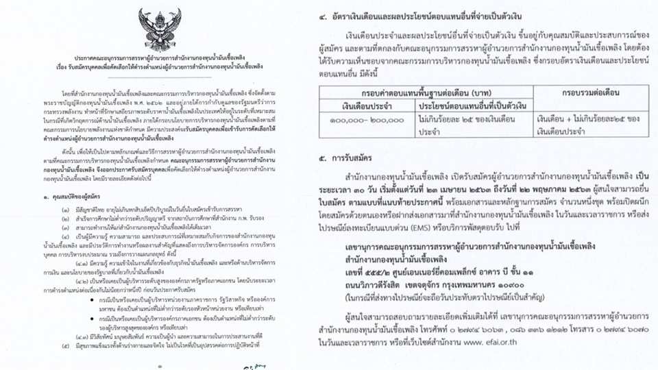 นายคุรุจิต นาครทรรพ ประธานอนุกรรมการสรรหาผู้อำนวยการสำนักงานกองทุนน้ำมันเชื้อเพลิง (สกนช.) เปิดเผยว่า สำนักงานฯ ประกาศรับสมัครบุคคลเพื่อคัดเลือกดำรงตำแหน่งผู้อำนวยการ สกนช.คนใหม่ แทนนายวีระพล จิรประดิษฐกุล ผู้อำนวยการคนเดิมที่ครบวาระเมื่อวันที่ 19 เมษายนที่ผ่านมา โดยเปิดรับสมัครตั้งแต่วันที่ 22 เมษายนถึงวันที่ 22 พฤษภาคม คุณสมบัติ สำคัญ เช่น มีสัญชาตีไทย อายุไม่เกิน 61 ปีบริบูรณ์ในวันยื่นใบสมัครเข้ารับการสรรหา สำเร็จการศึกษาไม่ต่ำกว่าระดับปริญญาตรี เป็นผู้มีความรู้ความสมารถ และประสบการณ์ที่เหมาะสมกับกิจการของสำนักงานกองทุนน้ำมันเชื้อเพลิง มีความรู้ ความเข้าใจในงานที่เกี่ยวข้กับธุรกิจน้ำมันเชื้อเพลิง และหรือนบริหารจัตการการเงิน และนโบายของรัฐบาลที่เกี่ยวกับน้ำมันเชื้อเพลิง เป็นหรือเคยเป็นผู้บริหารระดับสูงขององค์กรภาครัฐหรือภาคเอกชน โดยนับระยะเวลาการดำรงตำแหน่งต่อเนื่องกันไม่น้อยกว่า 1 ปี ก่อนวันประกาศรับสมัคร กรณีเป็นหรือเคยเป็นผู้บริหารหน่วยงานภาคราชการ รัฐวิสาหกิจ หรือองค์การมหาชน ต้องเป็นตำแหน่งที่ไม่ต่ำกว่าระดับรองหัวหน้าหน่วยงาน หรือเทียบเท่า