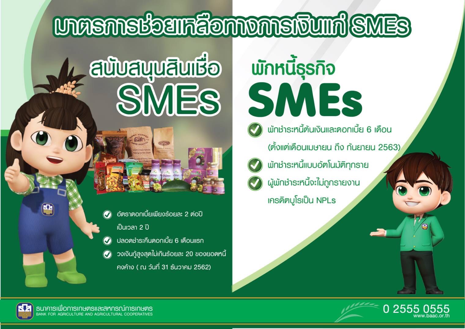 1) มาตรการพักชำระหนี้ธุรกิจ SMEs โดยพักชำระหนี้ต้นเงินและดอกเบี้ย 6 เดือน ตั้งแต่เมษายน ถึง กันยายน 2563 แบบอัตโนมัติทุกราย ให้กับลูกค้า SMEs และ SMEs เกษตร ของ ธ.ก.ส. ได้แก่ เกษตรกร บุคคล ผู้ประกอบการ (นิติบุคคล) กลุ่มเกษตรกร วิสาหกิจชุมชน กองทุนหมู่บ้านหรือชุมชน และสหกรณ์ภาคการเกษตร ที่ประกอบธุรกิจในกระบวนการรวบรวม การแปรรูป การตลาด และการบริการที่ประกอบธุรกิจในประเทศไทย มีสถานะหนี้ไม่เป็น NPLs ณ วันที่ 31 ธันวาคม 2562 และมีวงเงินกู้รวมไม่เกิน 100 ล้านบาท ซึ่งผู้ค้ำประกันไม่ต้องลงนามสัญญา อีกทั้งลูกหนี้ที่ได้รับสิทธิ์จะไม่ถูกรายงานเครดิตบูโรเป็น NPLs ทั้งนี้ หากลูกหนี้ประสงค์ชำระค่างวดในช่วงของการพักชำระหนี้ ไม่ถือว่าลูกหนี้ สละสิทธิ์ในการร่วมโครงการ โดย ธ.ก.ส. ยังคืนดอกเบี้ยให้ร้อยละ 10 ของเงินที่ส่งชำระ (Cash Back)