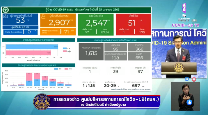 Dr Taweesin Visanuyothin, spokesman of the Center for COVID-19 Situation Administration, said the new 53 cases raised the total to 2,907 while the death toll increased to 51. Fifty-seven patients recovered and the total of recovery cases went up to 2,547.