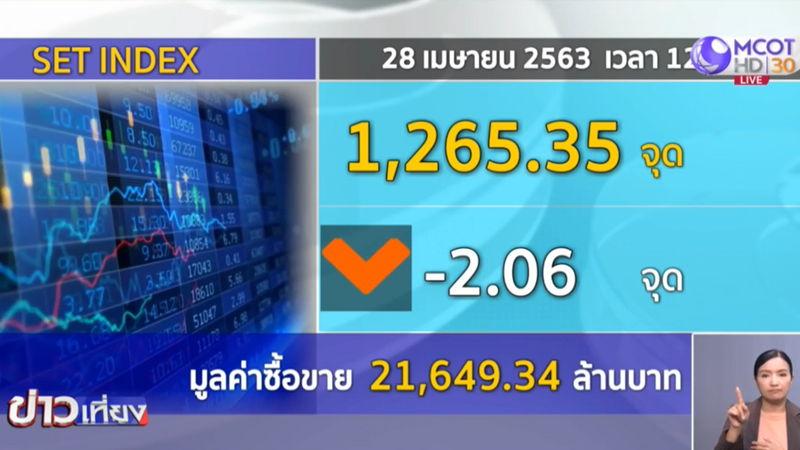 ดัชนีหุ้นไทยช่วงเช้าวันนี้ (28 เม.ย.) ลดลงเล็กน้อย 2.06 จุด อยู่ที่ 1,265.35 จุด ด้วยมูลค่าการซื้อขายเบาบางกว่า 21,000 ล้านบาท ดีดตัวขึ้นมาได้ช่วงเช้า ตามตลาดต่างประเทศ รับกับดาวโจนส์ที่บวกได้ หลังจากสถานการณ์ผู้ติดเชื้อโควิด-19 ชะลอลง และทั่วโลกลุ้นมาตรการผ่อนคลายล็อกดาวน์