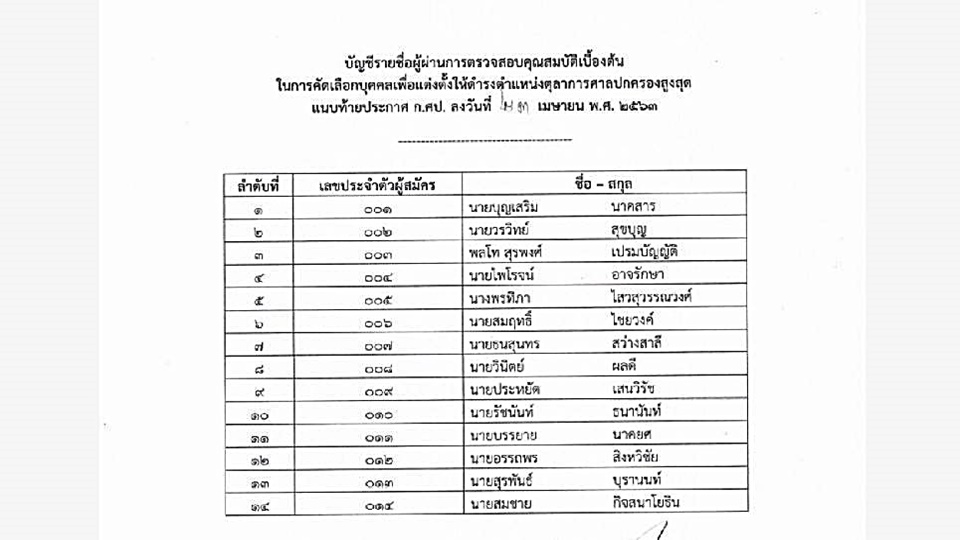 ผู้สื่อข่าวรายงานว่า เว็บไซต์สำนักงานศาลปกครองเผยแพร่ประกาศคณะกรรมการตุลาการศาลปกครองสูงสุด(ก.ศป.) เรื่องรายชื่อผู้ผ่านการตรวจสอบคุณสมบัติเบื้องต้นในการคัดเลือกบุคคล เพื่อแต่งตั้งให้ดำรงตำแหน่งตุลาการศาลปกครองสูงสุด โดยมีนายปิยะ ปะทังตา ประธานศาลปกครองสูงสุด ในฐานะประธานกรรมการตุลาการศาลปกครองสูงสุดเป็นผู้ลงนามในประกาศดังกล่าวเมื่อวันที่ 23 เมษายนที่ผ่านมา