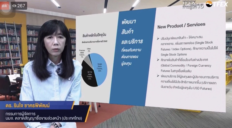 นางสาวรินใจ ชาครพิพัฒน์ กรรมการผู้จัดการ บมจ.ตลาดสัญญาซื้อขายล่วงหน้า (ประเทศไทย) หรือ TFEX กล่าวในโอกาส “TFEX ก้าวสู่ปีที่ 15” หัวข้อ “จุดเริ่มต้น โอกาส ความท้าทาย และทางเลือกทำกำไรที่คุณออกแบบได้” โดยยอมรับว่าปีนี้เป็นปีที่ตลาดมีความผันผวนและท้าทายมากที่สุดในรอบ 14 ปี หากวัดจากดัชนี SET50 ช่วง 3 เดือนแรกตลาดผันผวนถึงระดับ 50 จากช่วงปกติที่จะผันผวนอยู่ในระดับ 10-20 อย่างไรก็ตาม ในช่วงตลาดขาลง TFEX ถือเป็นโอกาสลงทุน เนื่องจากสามารถทำกำไรได้ทั้งในภาวะที่ตลาดหุ้นอยู่ในช่วงที่เป็นทั้งขาขึ้นและขาลง