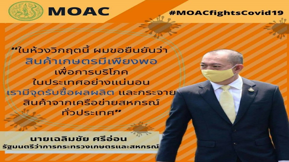 นายเฉลิมชัย ศรีอ่อน รัฐมนตรีว่าการกระทรวงเกษตรและสหกรณ์ กล่าวว่า ให้นโยบายผู้บริหารระดับสูงของกระทรวงและอธิบดีที่เกี่ยวข้องดูแลผลผลิตให้มีคุณภาพและจัดระบบกระจายสินค้าเกษตรให้ทั่วถึงทั้งประเทศ ยืนยันว่าหลัง ครม.ขยาย พ.ร.ก.การบริหารราชการในสถานการณ์ฉุกเฉินต่ออีก 1 เดือน เพื่อป้องกันและควบคุมการแพร่ระบาดของโควิด-19 สินค้าเกษตรมีเพียงพอต่อการบริโภคในประเทศแน่นอน