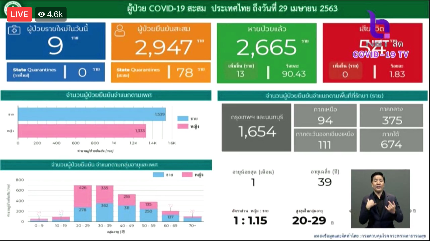 Spokesman of the Center for the Covid-19 Situation Administration (CCSA) Dr Taweesin Visanuyothin said the total coronavirus cases in the country rose to 2,947 and the death toll remains at 54.
