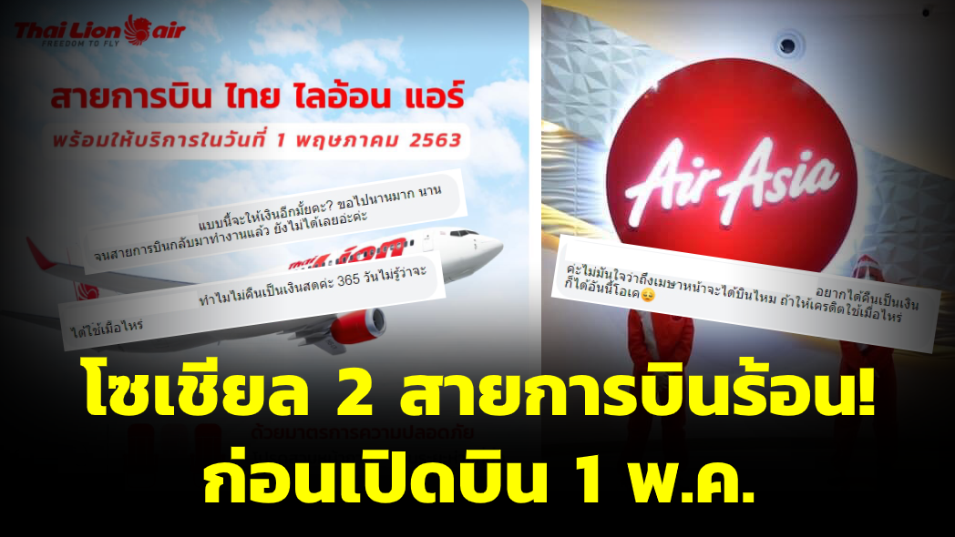 สำนักข่าวไทย 29 เม.ย. 63 – สายการบินไทยไลอ้อนแอร์-แอร์เอเชีย ร้อนก่อนเปิดบิน 1 พ.ค. ผู้โดยสารโวยการขอเงินคืนล่าช้า อยากได้เงินคืน ขณะที่บางรายไม่มั่นใจว่าจะได้เงินคืน ด้านสายการบินโอดพิษโควิด-19 หยุดบินทุกเส้นทางทั้งในและต่างประเทศ ทำขาดสภาพคล่องรุนแรง