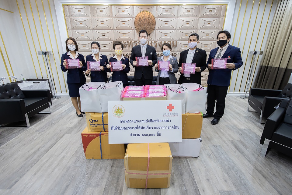 นายดวงฤทธิ์ เบ็ญจาธิกุล ชัยรุ่งเรือง ผู้ช่วยรัฐมนตรีประจำกระทรวงแรงงาน พร้อมด้วยนางเธียรรัตน์ นะวะมะวัฒน์ รองปลัดกระทรวงแรงงาน และผู้บริหารระดับสูง ส่งมอบหน้ากากผ้า จำนวน 100,000 ชิ้นให้กับ นางสุนันทา ศรอนุสิน ผู้อำนวยการสำนักงานยุวกาชาด สภากาชาดไทย เพื่อนำไป แจกจ่ายให้ประชาชนในการป้องกันการแพร่ระบาดของโรคติดเชื้อไวรัสโคโรนา 2019 หรือโรคโควิด – 19 ต่อไป