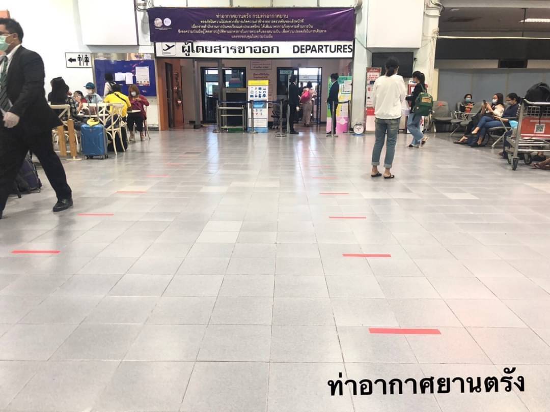2. ต้องปฏิบัติตามมาตรการเว้นระยะห่างทางสังคม (Social Distancing) เช่น จุดรับรอรับกระเป๋าสัมภาระ จุดตรวจบัตรโดยสาร (Check – in counter) ที่นั่งรอก่อนการเดินทาง โดยให้มีระยะห่างอย่างน้อย 1 เมตร