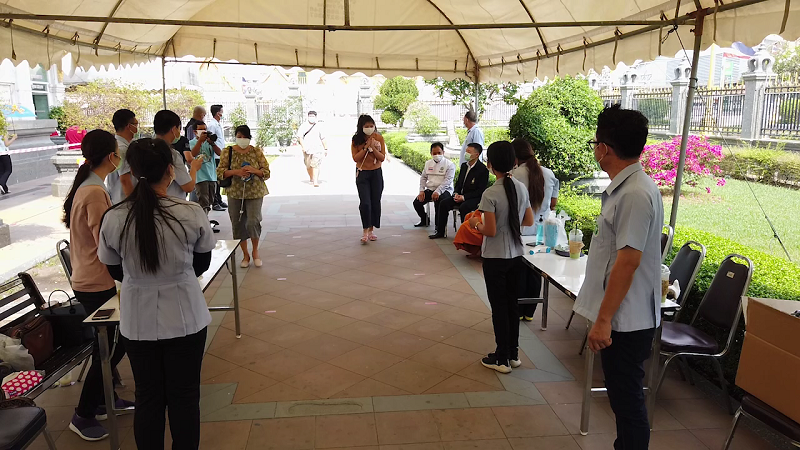 2.ตรวจวัดอุณหภูมิก่อนเข้าไปในพระอุโบสถฯ โดยเรียงแถวให้เป็นระเบียบ