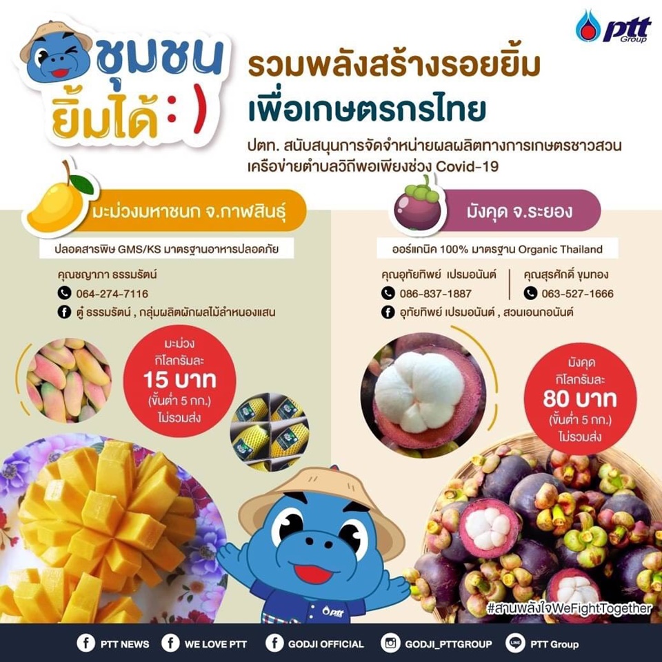 บริษัท ปตท.จำกัด (มหาชน) สนับสนุนการจัดจำหน่ายผลผลิตทางการเกษตรชาวสวนไทยในช่วงโควิด-19 ได้แก่ มะม่วงมหาชนก ปลอดสารพิษ GMP / KS (มาตรฐานอาหารปลอดภัยจังหวัดกาฬสินธุ์) คุณภาพดี สิงค้าส่งออกต่างประเทศ ร้อยละ 90 เช่น จีน ญี่ปุ่น มะม่วงมหาชนก หรือราชาทรงโปรดเป็นมะม่วงนามพระราชทาน ผลสุกผิวสีเหลืองทองจนถึงสีแดงทั้งผล รสชาติหวาน หอม เนื้อแน่น ช่วยลดความเสี่ยงในการเป็นโรคมะเร็ง ราคากิโลกรัมละ 15 บาท (ขั้นต่ำ 5 กก.) ไม่รวมส่งสำหรับช่องทางการสั่งซื้อมะม่วง คุณชญาภา ธรรมรัตน์ โทร. 064-274-7116 หรือ Facebook : ตู๋ ธรรมรัตน์ (https://www.facebook.com/arunwan.tammarat ) กลุ่มผลิตผักผลไม้ลำหนองแสน m.me/2021765884775563) Line : 064-274-7116