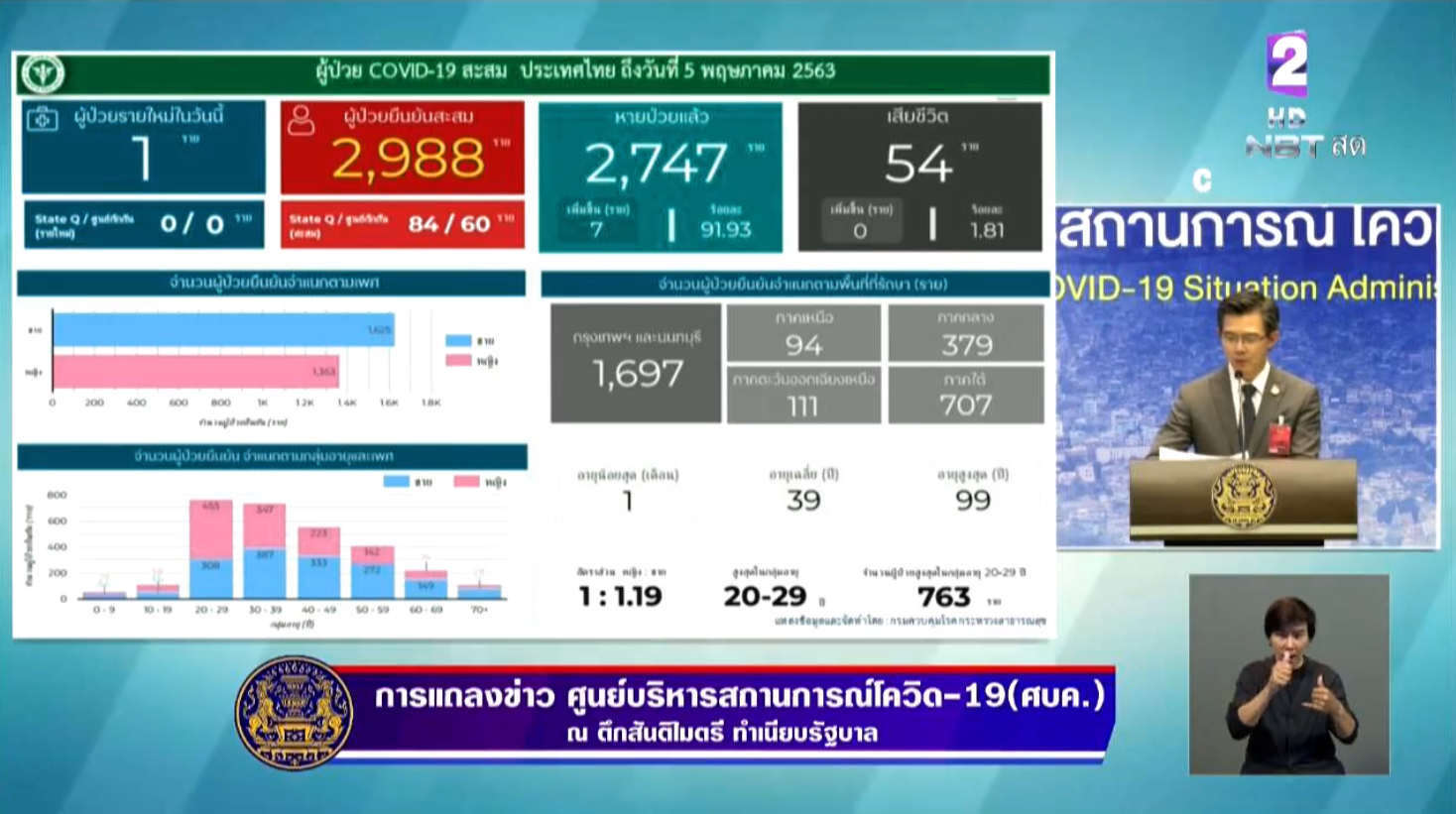 BANGKOK, May 5 (TNA) – Thailand recorded one new coronavirus case, raising the total cases in the country to 2,988 and no new deaths.