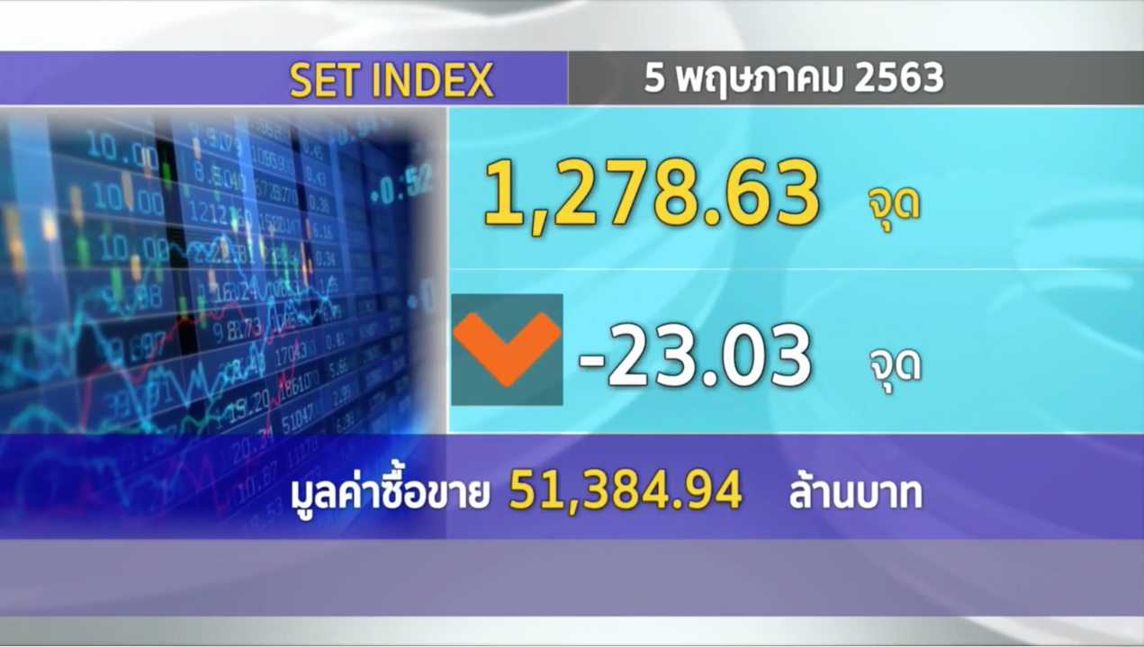 กทม. 5 พ.ค.- ดัชนีตลาดหลักทรัพย์ฯ ปิดวันนี้ (5 พ.ค.) ที่ระดับ 1,278.63 จุด ลดลง 23.03 จุด (-1.77%) มูลค่าการซื้อขาย 51,384.94 ล้านบาท โดยดัชนีหุ้นไทยเคลื่อนไหวแดนลบตลอดทั้งวัน ทำระดับสูงสุด 1,289.09 จุด และต่ำสุด 1,278.50 จุด.-สำนักข่าวไทย