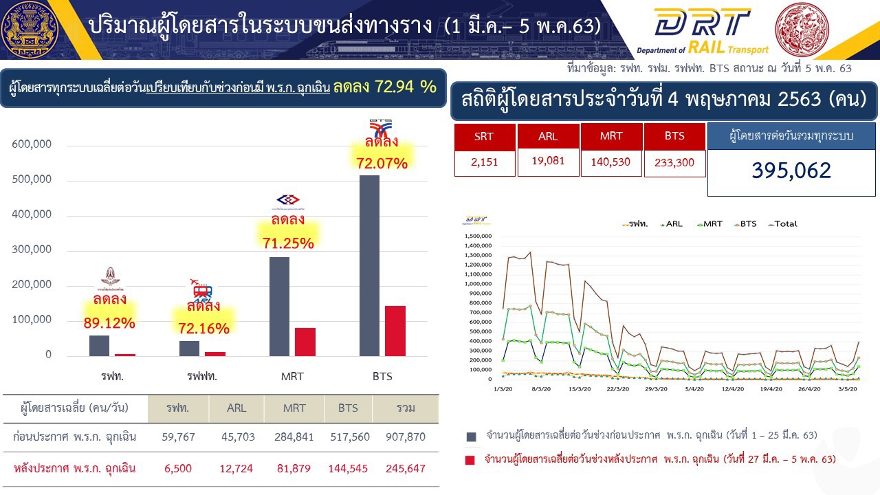 ในพื้นที่กรุงเทพฯมหานคร เมื่อวันที่ 4 พฤษภาคม 2563 หลังรัฐบาลเริ่มผ่อนคลายกิจกรรมทางเศรษฐกิจ พบว่ามีประชาชนใช้บริการระบบรถไฟฟ้า เฉลี่ยเกือบ 400,000คน ต่อวัน เพิ่มขึ้นจากสภาวการณ์ก่อนผ่อนคลายเศรษฐกิจ โดยในช่วงต้นเดือนวันที่ 1 พฤษภาคมที่ผ่านมา ระบบรถไฟฟ้า มีผู้ใช้บริการ เฉลี่ยเพียง
