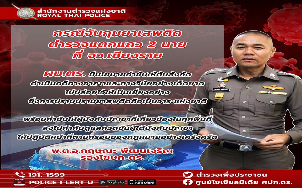 พ.ต.อ.กฤษณะ พัฒนเจริญ รองโฆษก ตร. เปิดเผยถึงความคืบหน้ากรณีสื่อสังคมออนไลน์นำเสนอข่าว “จับ ส.ต.ท. แตกแถว ขนยาบ้ากว่า 8แสนเม็ด” ว่าได้รับรายงานจาก สภ.บ้านดู่ จว.เชียงราย ว่า ขณะนี้เจ้าหน้าที่ตำรวจได้จับกุมตัว ส.ต.ท.ธวัชชัย คำปวง ผบ.หมู่ กก.ตชด.32 ไว้แล้ว ตั้งแต่วันที่ 5 พ.ค. 63 เวลา 05.00 น. บริเวณสี่แยกไฟแดง (ถ.สายบายพาส) บ้านป่ากุ๊ก ต.บ้านตู่ อ.เมือง จว.เชียงราย และได้นำตัวผู้ต้องหาพร้อมของกลาง ซึ่งมียาเสพติดให้โทษประเภทที่1 (ยาบ้า) จำนวน 6กระสอบ ประมาณ 780,000 เม็ด ส่งพนักงานสอบสวน สภ.บ้านดู่ ดำเนินคดีตามกฎหมาย