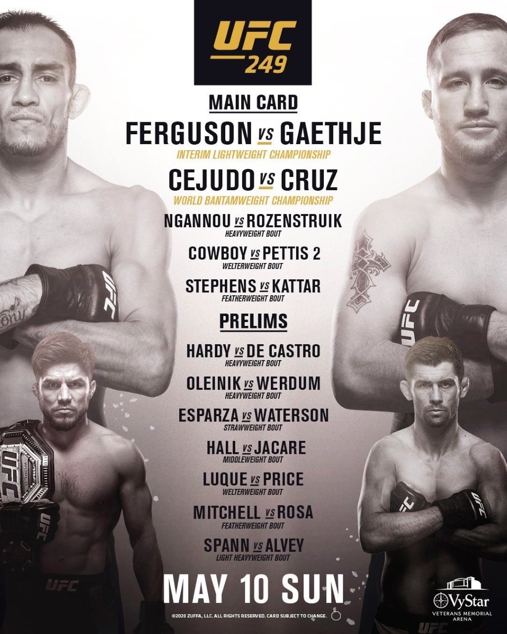 ก่อนหน้านี้ ศึก UFC 249 ที่มีคู่เอกเป็นศึกชิงแชมป์เฉพาะกาลรุ่นไลท์เวตระหว่าง โทนี เฟอร์กูสัน กับ จัสติน เกทจี และคู่รอง การป้องกันแชมป์โลกรุ่นแบนตัมเวตของ เฮนรี เซฮูโด กับ โดมินิก ครูซ ได้ยืนยันวันแข่งขันเป็นช่วงเช้าวันอาทิตย์ที่ 10 พฤษภาคมตามเวลาประเทศไทย