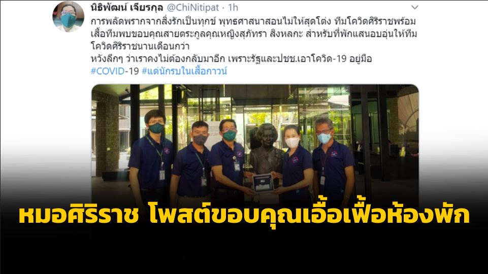 รศ.นพ.นิธิพัฒน์ เจียรกุล ภาควิชาอายุรศาสตร์ คณะแพทยศาสตร์ศิริราชพยาบาล มหาวิทยาลัยมหิดล โพสต์ผ่านทวิตเตอร์ส่วนตัววันนี้ (7พ.ค.) ใจความว่า “การพลัดพรากจากสิ่งรักเป็นทุกข์ พุทธศาสนาสอนไม่ให้สุดโต่ง ทีมโควิดศิริราชพร้อมเสื้อทีม พบขอบคุณสายตระกูลคุณหญิงสุภัทรา สิงหลกะ สำหรับที่พักแสนอบอุ่นให้ทีมโควิดศิริราชนานเดือนกว่า หวังลึกๆ ว่าเราคงไม่ต้องกลับมาอีก เพราะรัฐและประชาชนเอาโควิด-19 อยู่มือ #COVID-19 #แด่นักรบในเสื้อกาวน์”