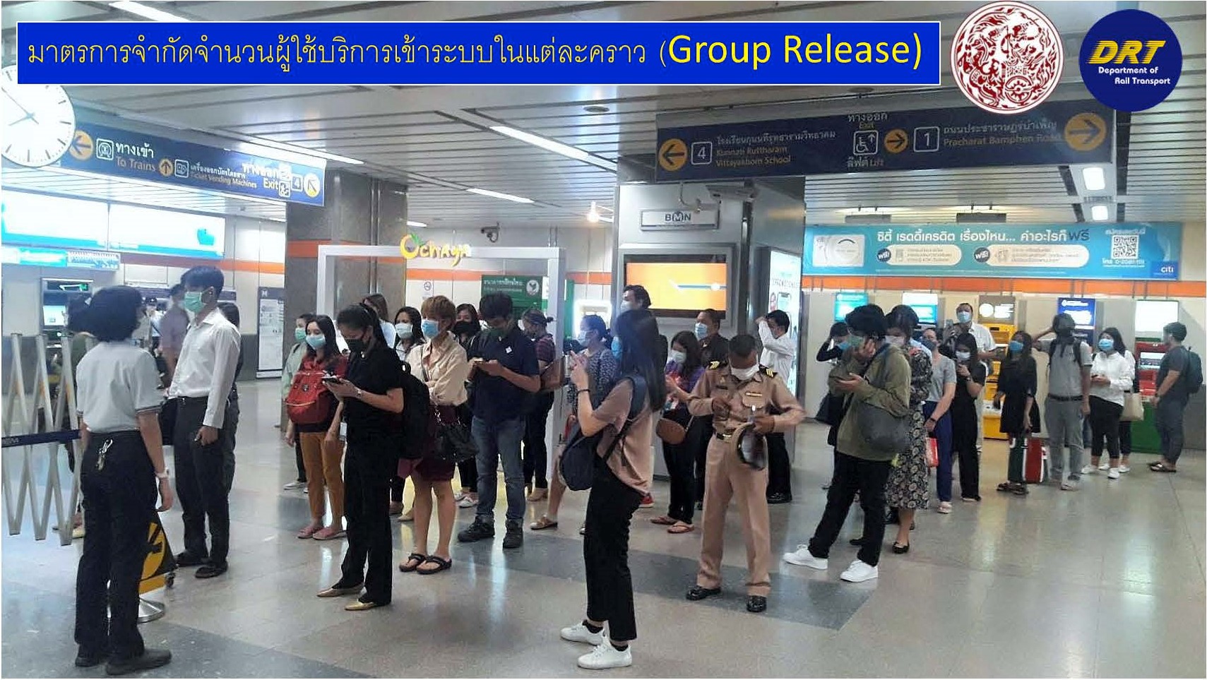 หากมีความหนาแน่นของผู้ใช้บริการที่เข้ามาในระบบเกินขีดความสามารถในการรองรับจนกระทบต่อการดำเนินมาตรการเว้นระยะห่างทางสังคมให้บริหารจัดการมาตรการจำกัดจำนวนผู้ใช้บริการเข้าระบบแต่ละคราว (Group Release) จำแนกเป็น 3 ตอน คือ ตอนที่ 1 ก่อนการขึ้น -ลง เข้าสู่ชั้นจำหน่ายบัตรโดยสาร ตอนที่ 2 ก่อนการผ่าน หน้าประตูกั้นจัดเก็บค่าโดยสาร และตอนที่ 3 ก่อนเข้าสู่ขบวนรถ รวมถึงเพิ่มช่องทางการประชาสัมพันธ์ให้ประชาชนทราบเกี่ยวกับแนวทางการใช้บริการตามข้อดังกล่าว พร้อมทั้งขอความร่วมมือในการปฏิบัติ วางแผนการเดินทาง และเผื่อเวลาในการเดินทางเพื่อให้สามารถลดความหนาแน่นและคงการปฏิบัติมาตรการเว้นระยะห่างทางสังคมได้อย่างมีประสิทธิผล ขณะเดียวกันขอให้เพิ่มเจ้าหน้าที่หรือสนธิกำลังร่วมกับหน่วยงานที่เกี่ยวข้อง เพื่อแก้ไขปัญหา/สถานการณ์ฉุกเฉินเร่งด่วน หากมีอุปสรรคขัดข้องในการดำเนินการ ขอความกรุณาแจ้งอธิบดีกรมการขนส่งทางรางทันที