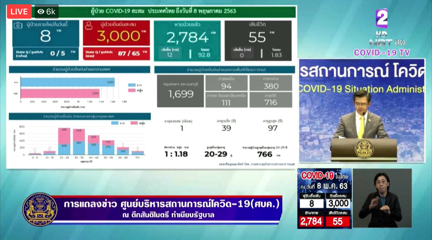 The Center for Covid-19 Situation Administration (CCSA) spokesman, Taweesin Visanuyothin said in a daily briefing that there have been no new deaths related to the Covid-19 and the death toll remains at 55.