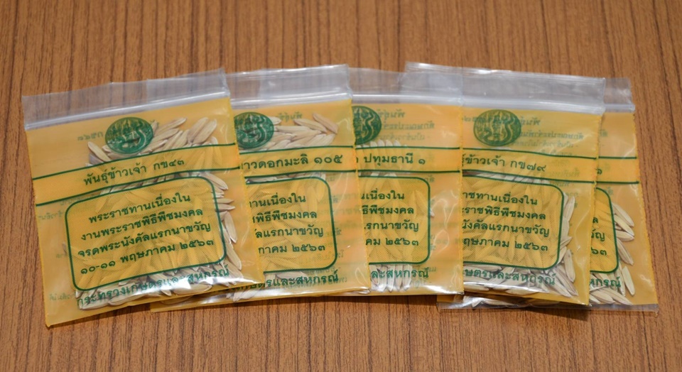 นายสุดสาคร ภัทรกุลนิษฐ์ อธิบดีกรมการข้าว กล่าวว่า ปีนี้กรมการข้าวได้ขอพระราชทานพระบรมราชานุญาต พระบาทสมเด็จพระปรเมนทรรามาธิบดีศรีสินทรมหาวชิราลงกรณ พระวชิรเกล้าเจ้าอยู่หัว นำเมล็ดพันธุ์ข้าวทรงปลูกพระราชทานทั้งหมด 5 พันธุ์ จำนวน 1,458 กิโลกรัม เข้าพิธีในพระอุโบสถวัดพระศรีรัตนศาสดาราม เป็นการทำขวัญเมล็ดพันธุ์พืชต่าง ๆ เพื่อให้ปลอดจากโรคและเจริญงอกงามสมบูรณ์ ซึ่งเป็นข้าวนาสวนที่มีคุณลักษณะและความโดดเด่นด้านต่าง ๆ ประกอบด้วย