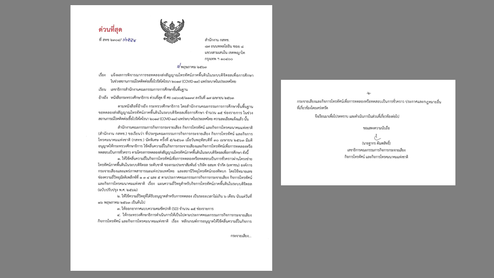 สำนักงานคณะกรรมการการศึกษาขั้นพื้นฐาน (สพฐ.) แจ้งว่า เมื่อวันที่ 8 พฤษภาคม 2563 สำนักงานคณะกรรมการกิจการกระจายเสียง กิจการโทรทัศน์ และกิจการโทรคมนาคมแห่งชาติ (กสทช.) ได้ส่งหนังสือมาถึงสพฐ.แจ้งผลการพิจารณาการขอทดลองส่งสัญญาณโทรทัศน์ภาคพื้นดินในระบบดิจิตอลเพื่อการศึกษา ในช่วงสถานการณ์โรคติดเชื้อไวรัสโคโรนา 2019 (COVID-19) แพร่ระบาดในประเทศไทย โดยมีใจความว่า