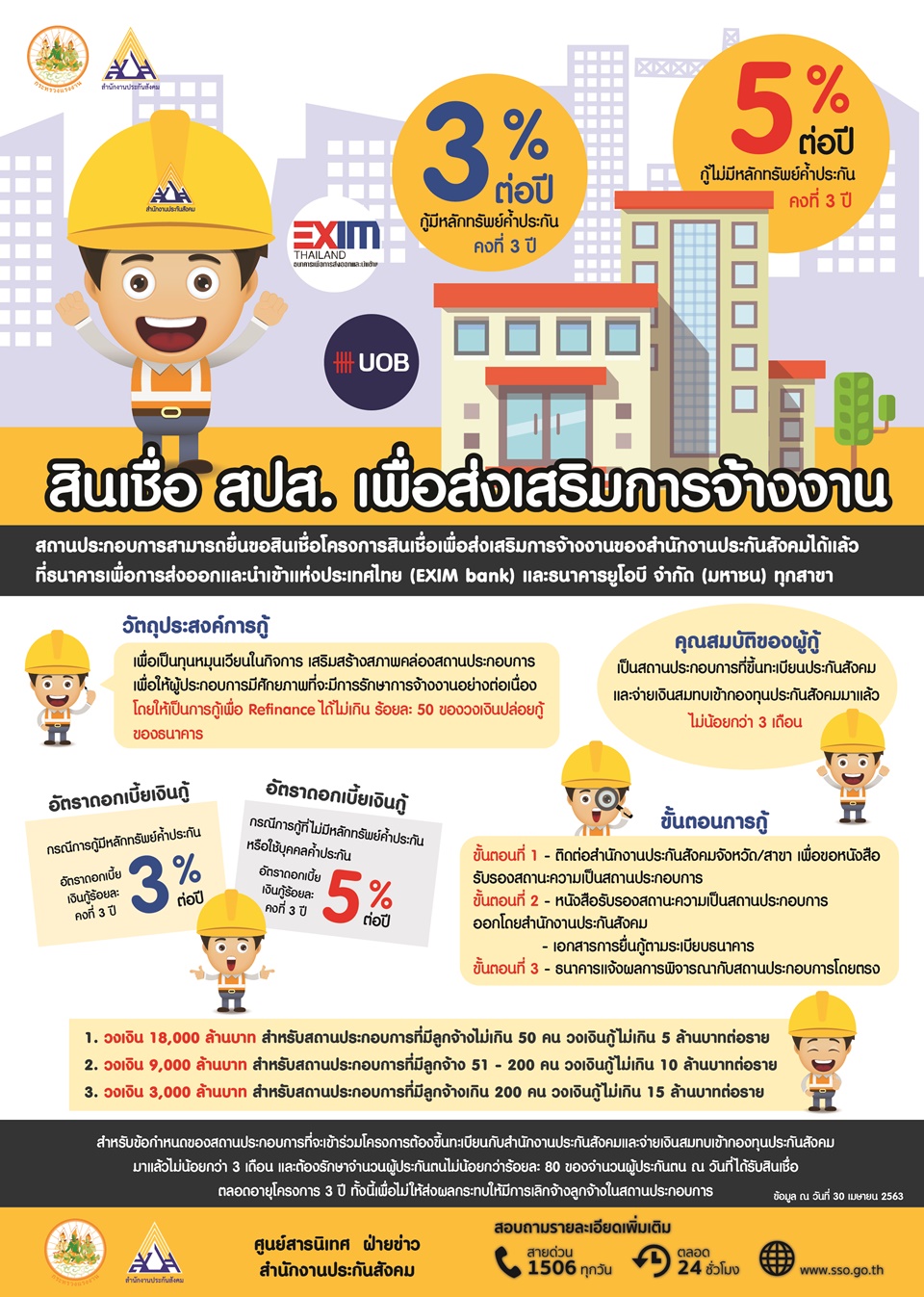 นางพิศมัย นิธิไพบูลย์ หัวหน้าผู้ตรวจราชการกรม สำนักงานประกันสังคม (สปส.) ในฐานะโฆษกสำนักงานฯ เปิดเผยว่า จากที่รัฐบาลและกระทรวงแรงงาน ได้มีมาตรการเพื่อช่วยเหลือผู้ประกอบการ ที่ได้รับผลกระทบจากสภาวะเศรษฐกิจจากโรคโควิด-19ให้สามารถรักษาการจ้างงานให้ผู้ประกันตนมีงานทำต่อเนื่องและอยู่ในระบบประกันสังคมนั้น ทางสำนักงานฯได้มีโครงการสินเชื่อเพื่อส่งเสริมการจ้างงาน วงเงินไม่เกิน 3หมื่นล้านบาท เพื่อให้สถานประกอบการกู้เป็นทุนหมุนเวียนในกิจการเสริมสภาพคล่อง ให้มีศักยภาพ มีการจ้างงานอย่างต่อเนื่อง