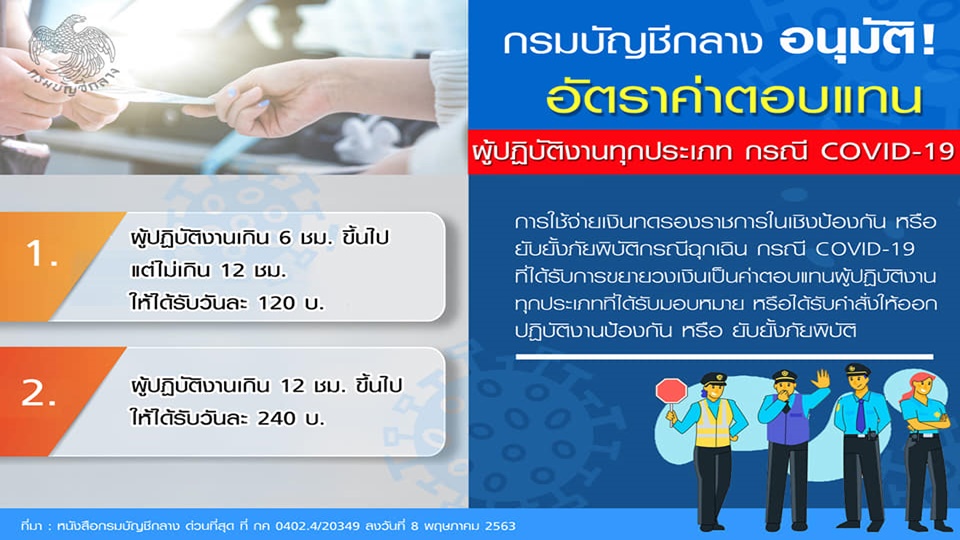 ก.คลัง 10 พ.ค. – กรมบัญชีกลางอนุมัติค่าตอบแทนผู้ปฏิบัติงานทุกประเภท กรณี COVID-19 จากเงินทดรองราชการฯ ที่ได้รับการขยายวงเงินฯ เป็นกรณีพิเศษ