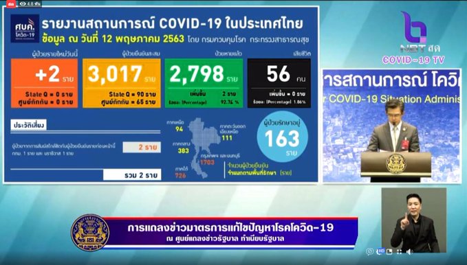 BANGKOK, May 12 (TNA) – Thailand on Tuesday reported two new coronavirus infections and no new deaths, raising the total cases to 3,017.
