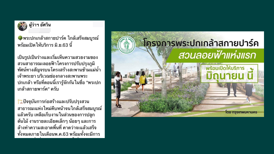 พล.ต.อ.อัศวิน ขวัญเมือง ผู้ว่าราชการกรุงเทพมหานคร (ผู้ว่าฯกทม.) โพสต์ผ่านเฟซบุ๊ก “ผู้ว่าฯอัศวิน” ว่า เป็นรูปเป็นร่างและเริ่มเห็นความสวยงามของสวนสาธารณะลอยฟ้าโครงการปรับปรุงภูมิทัศน์ทางสัญจรบนโครงสร้างสะพานข้ามแม่น้ำเจ้าพระยา บริเวณช่องกลางสะพานพระปกเกล้า หรือที่ตอนนี้เรารู้จักกันในชื่อ “พระปกเกล้าสกายพาร์ค”