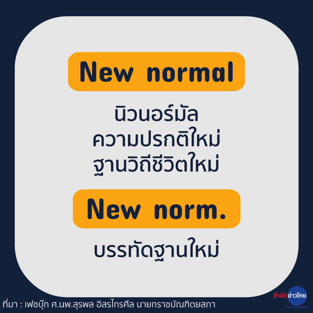 สำนักข่าวไทย 14 พ.ค. 63 – ตามที่ ศ.นพ.สุรพล อิสรไกรศีล นายกราชบัณฑิตยสภา ได้โพสต์ชี้แจงรายละเอียดทางเฟซบุ๊กเมื่อวานนี้ (13 พ.ค. 63) เวลา 18.05 น. เรื่องการบัญญัติศัพท์คำว่า “New normal ” และ “New norm.” สรุปได้ว่า