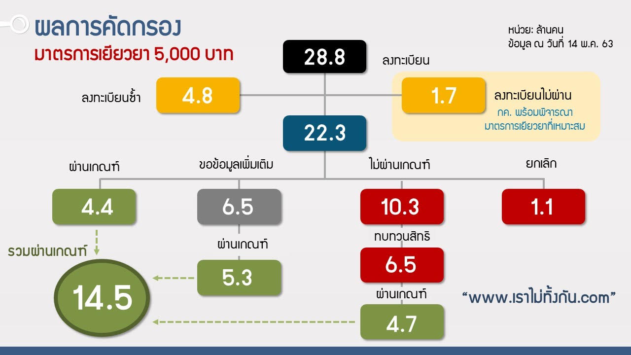 กรุงเทพฯ 14 พ.ค. -มาตรการเยียวยา 5,000 บาท มีผู้ผ่านเกณฑ์แล้ว 14.5 ล้านราย ปิดระบบการขอข้อมูลการประกอบอาชีพเพิ่มเติมในวันศุกร์ที่ 15 พฤษภาคม 2563 เวลา 24.00 น.