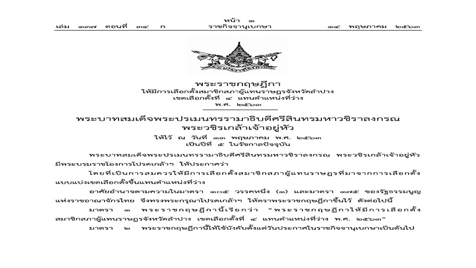 เว็บไซด์ราชกิจจานุเบกษาเผยแพร่พระราชกฤษฎีกาให้มีการเลือกตั้งสมาชิกสภาผู้แทนราษฎรจังหวัดลำปาง เขตเลือกตั้งที่ 4 แทนตำแหน่งที่ว่าง พ.ศ. 2563 โดยระบุว่า พระบาทสมเด็จพระปรเมนทรรามาธิบดีศรีสินทรมหาวชิราลงกรณ พระวชิรเกล้าเจ้าอยู่หัว มีพระบรมราชโองการโปรดเกล้าฯให้ประกาศว่า โดยที่เป็นการสมควรให้มีการเลือกตั้งสมาชิกสภาผู้แทนราษฎรที่มาจากการเลือกตั้งแบบแบ่งเขตเลือกตั้งขึ้นแทนตำแหน่งที่ว่าง อาศัยอำนาจตามความในมาตรา 105 วรรคหนึ่ง( 1) และมาตรา 175 ของรัฐธรรมนูญแห่งราชอาณาจักรไทย จึงทรงพระกรุณาโปรดเกล้าฯ ให้ตราพระราชกฤษฎีกาขึ้นไว้ดังต่อไปนี้ มาตรา 1 พระราชกฤษฎีกานี้เรียกว่า “พระราชกฤษฎีกาให้มีการเลือกตั้งสมาชิกสภาผู้แทนราษฎรจังหวัดลำปาง เขตเลือกตั้งที่ 4 แทนตำแหน่งที่ว่าง พ.ศ. 2563”