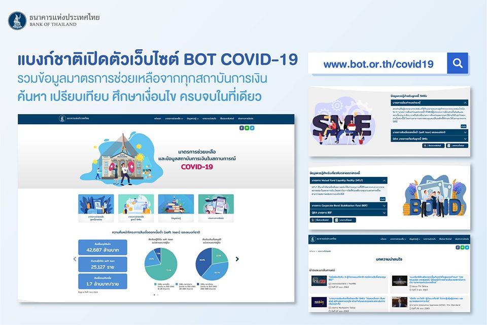 เพื่อประโยชน์ในการหาข้อมูลและติดตามความคืบหน้าของมาตรการต่าง ๆ ธปท. จึงได้จัดทำเว็บไซต์ BOT COVID-19 ขึ้น ซึ่งจะช่วยอำนวยความสะดวกให้ประชาชนและผู้ประกอบการสามารถเข้าถึงข้อมูลและมาตรการช่วยเหลือดังกล่าวได้อย่างรวดเร็วขึ้น ช่วยให้ผู้ใช้งานสามารถค้นหา เปรียบเทียบ และศึกษาเงื่อนไขของมาตรการช่วยเหลือต่าง ๆ