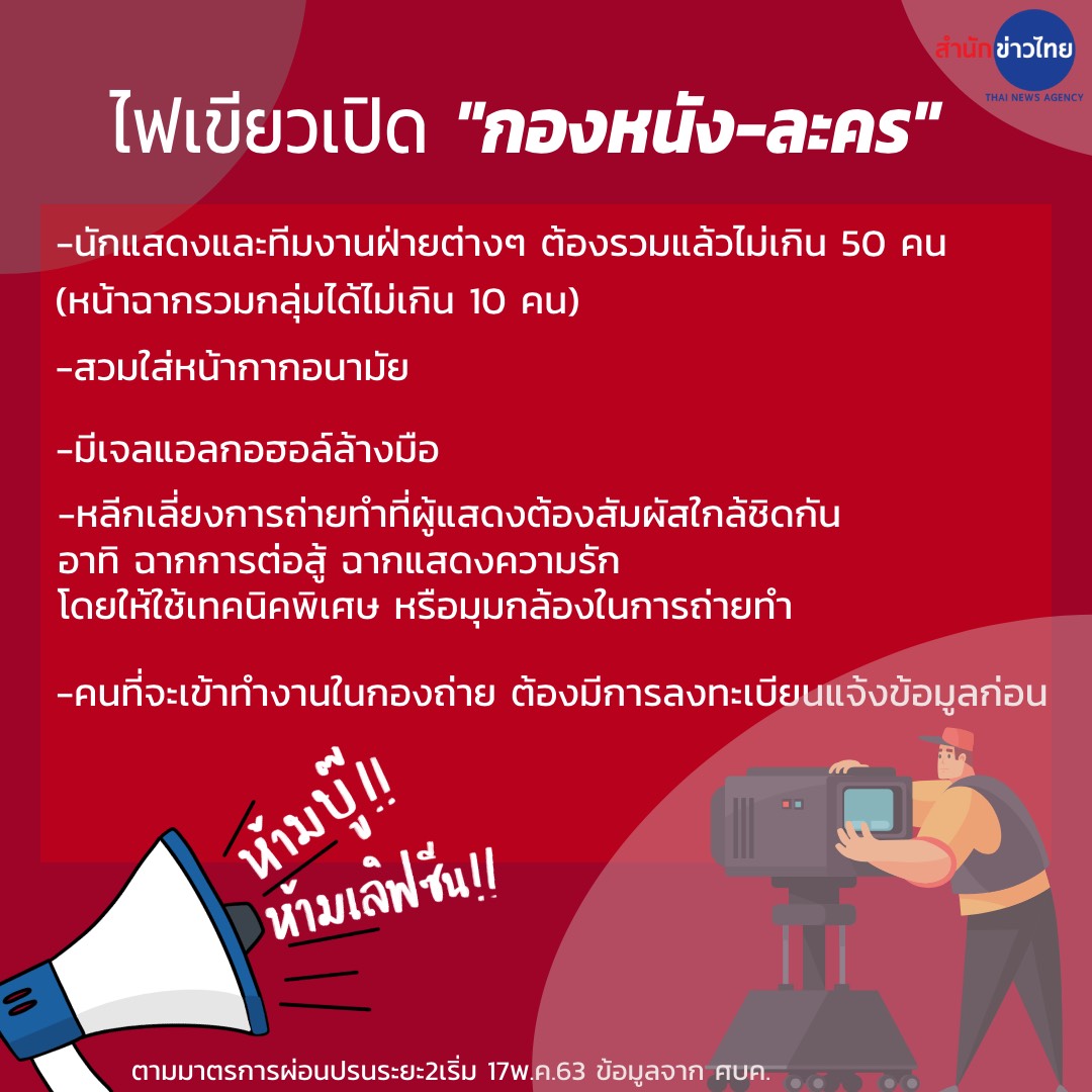 สำนักข่าวไทย 15 พ.ค.63 -. คนทำงานกองละคร–ถ่ายหนัง เตรียมเฮ ไฟเขียวเปิดกองได้แล้ว ตามมาตรการผ่อนปรนระยะ2 เริ่ม 17 พ.ค.63