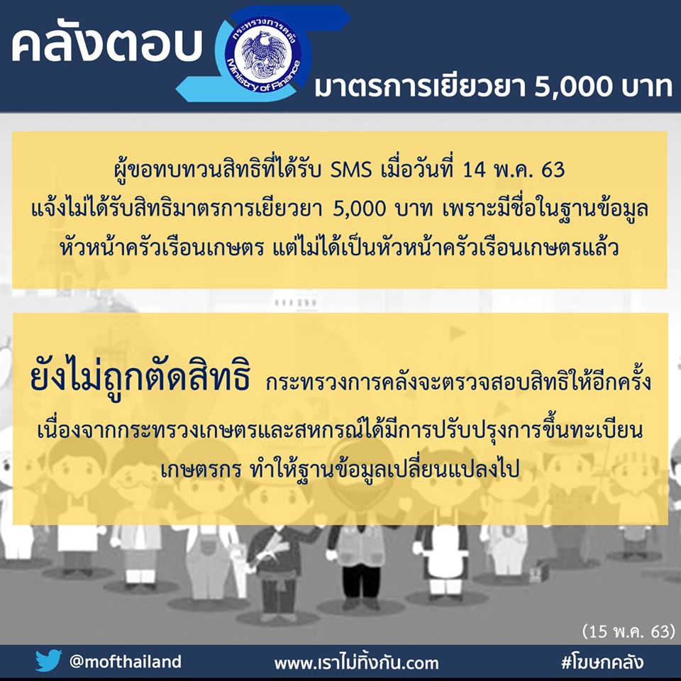 สำนักข่าวไทย 16 พ.ค. 63 – กระทรวงการคลังยังไม่ตัดสิทธิประชาชนกลุ่มผู้ยื่นขอทบทวนสิทธิที่ได้รับ SMS แจ้งว่า ไม่ได้รับสิทธิ “เราไม่ทิ้งกัน” เนื่องจากตรวจสอบพบว่ามีชื่อปรากฏอยู่ในฐานข้อมูลหัวหน้าครัวเรือนเกษตรของกระทรวงเกษตรและสหกรณ์