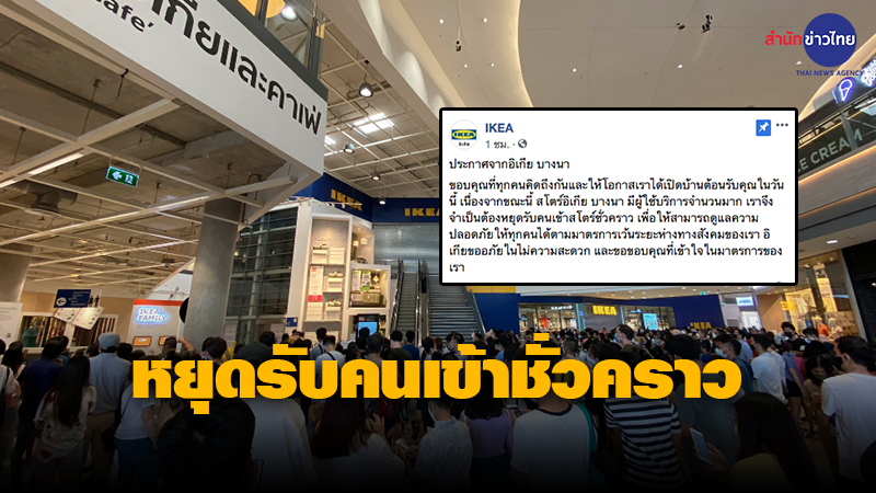 กทม. 17 พ.ค.- “IKEA” โพสต์เฟซบุ๊กเมื่อเวลา 14.35 น.ที่ผ่านมา ระบุ “อิเกีย บางนา” จำเป็นต้องหยุดรับคนเข้าสโตร์ชั่วคราว เนื่องจากมีผู้ใช้บริการจำนวนมาก เพื่อให้สามารถดูแลความปลอดภัยให้ทุกคนได้ตามมาตรการเว้นระยะห่างทางสังคม.-สำนักข่าวไทย