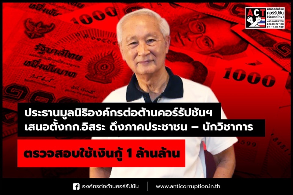 กทม.18 พ.ค.-ประธานมูลนิธิองค์กรต่อต้านคอร์รัปชันฯ เห็นด้วยเร่งเดินหน้า พ.ร.ก.กู้เงิน 1ล้านล้าน ฝ่าวิกฤติโควิด-19 แต่เกรงปัญหาทุจริตรั่วไหล แนะรัฐจัดทำเว็บไซต์เฉพาะกิจเปิดข้อมูลให้สังคมตรวจสอบได้ พร้อมเสนอตั้งคณะกรรมการตรวจสอบอิสระ ดึงภาคประชาชน นักวิชาการ ร่วมสกัดโกงทุกโครงการ