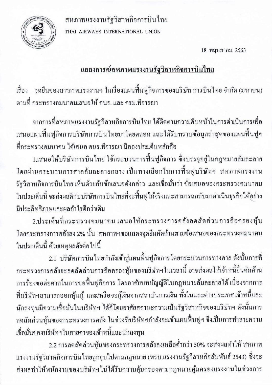 2.2 การลดสัดส่วนหุ้นของกระทรวงการคลังลงเหลือต่ำกว่า 50% จะส่งผลทำให้สหภาพแรงงานรัฐวิสาหกิจการบินไทยถูกยุบไปตามกฎหมาย (พ.ร.บ.แรงานรัฐวิสาหกิจสัมพันธ์ 2543) ทำให้พนักงานไม่ได้รับความคุ้มกรองตามกฎหมายคุ้มครองแรงงานในช่วงการดำเนินการตามแผนฟื้นฟู ชึ่งในแผนฟื้นฟูจะต้องมีการปรับลดพนักงาน ลด หรือยุบ บางตำแหน่งงาน รวมถึงลดสิทธิประโยชน์และสวัสดิการอื่น ๆ บางประการของพนักงาน ดังนั้น การลดสัดส่วนหุ้นของกระทรวงการคลังช่วงนี้ จึงอาจทำให้ถูกมองได้ว่ารัฐไม่มีความจริงใจในการสนับสนุนการคุ้มครองแรงงานตามวิถีทางของกฎหมายคุ้มครองแรงงาน และเลือกปฏิบัติในแนวทางที่ไม่คำนึงถึงสิทธิของลูกจ้างสหภาพฯ จึงไม่เห็นด้วยในการลดสัดส่วนการถือหุ้นของกระทรวงการคลัง และจะคัดค้านจนถึงที่สุด.-สำนักข่าวไทย