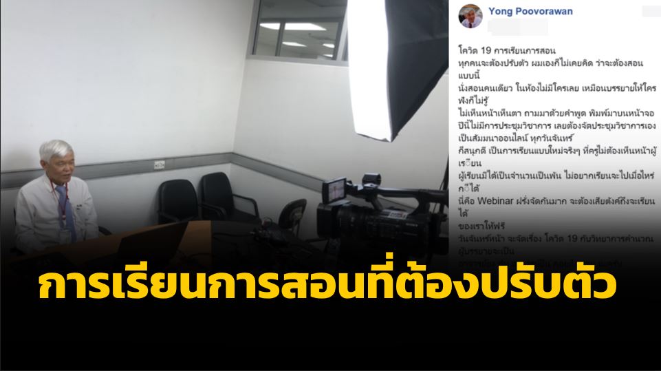 กทม.20 พ.ค.-“นพ.ยง”โพสต์การเรียนการสอนในช่วงโควิด-19ทุกคนต้องปรับตัว ชี้ไม่เคยคิดเหมือนกันว่าต้องนั่งสอนคนเดียวในห้อง มีผู้เรียนเป็นพันคนโดยไม่เห็นหน้าตา
