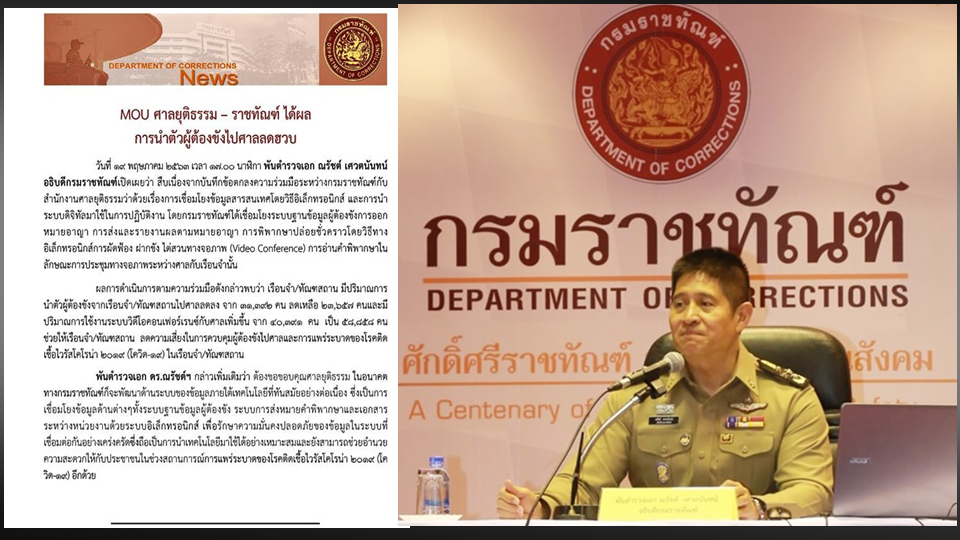 กรมราชทัณฑ์ 20 พ.ค.-MOU กรมราชทัณฑ์-ศาลยุติธรรม ได้ผล การนำตัวผู้ต้องขังไปศาลลดลง ลดความเสี่ยงในการควบคุมผู้ต้องขังไปศาลและการแพร่ระบาดของโรคโควิด-19