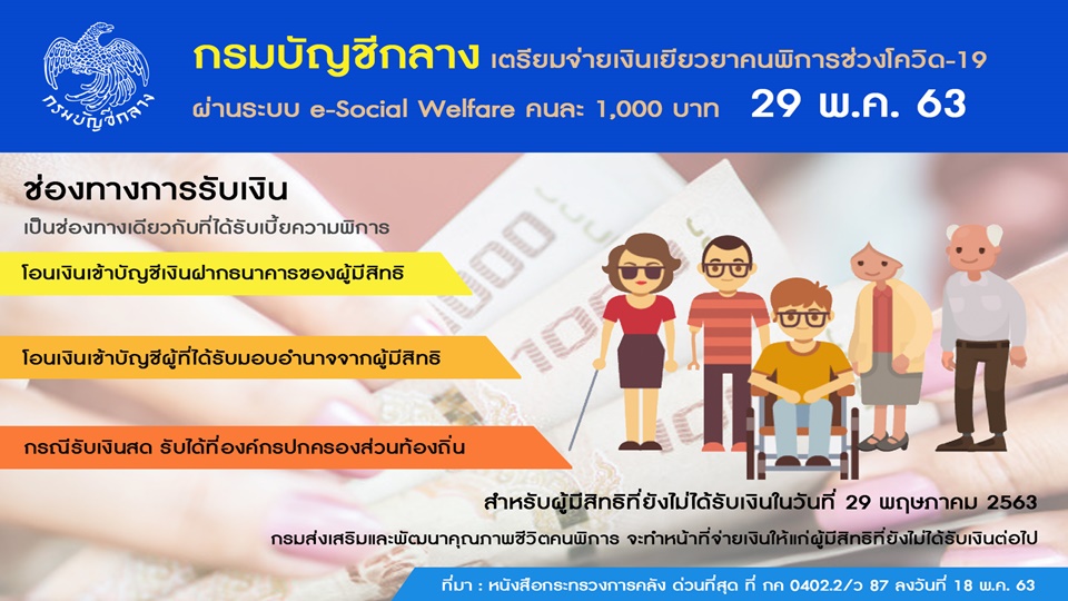 “ผู้มีสิทธิ์ที่ยังไม่ได้รับเงินวันที่ 29 พฤษภาคม 2563 ซึ่งเป็นกลุ่มที่ไม่ได้รับเบี้ยความพิการในฐานข้อมูลของกรมบัญชีกลาง รวมถึงผู้ที่ไม่สามารถโอนเงินเข้าบัญชีได้ เนื่องจากข้อมูลคลาดเคลื่อน สามารถสอบถามได้ที่กรมส่งเสริมและพัฒนาคุณภาพชีวิตคนพิการ เพื่อดำเนินการขอรับเงินต่อไป” โฆษกกรมบัญชีกลาง กล่าว.-สำนักข่าวไทย