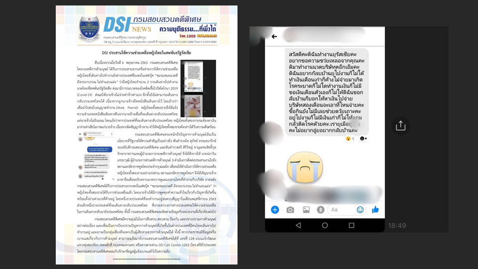 กรมสอบสวนคดีพิเศษ (ดีเเสไอ) รายงานว่า กองคดีการค้ามนุษย์ ได้รับการประสานจากเครือข่ายการให้ความช่วยเหลือหญิงไทยที่เดินทางไปทำงานยังต่างประเทศชื่อเพจในเฟซบุ๊ก “ชมรมหมอนวดดี มีจรรยาบรรณ ไม่ทำแอบแฝง” ว่ามีหญิงไทยจำนวน 2 รายเดินทางไปทำงานนวดไทยที่สหพันธรัฐรัสเซีย ต่อมามีการระบาดของโรคติดเชื้อไวรัสโคโรนา 2019 (Covid-19) ส่งผลให้นายจ้างไม่จ่ายค่าจ้างค่าแรง