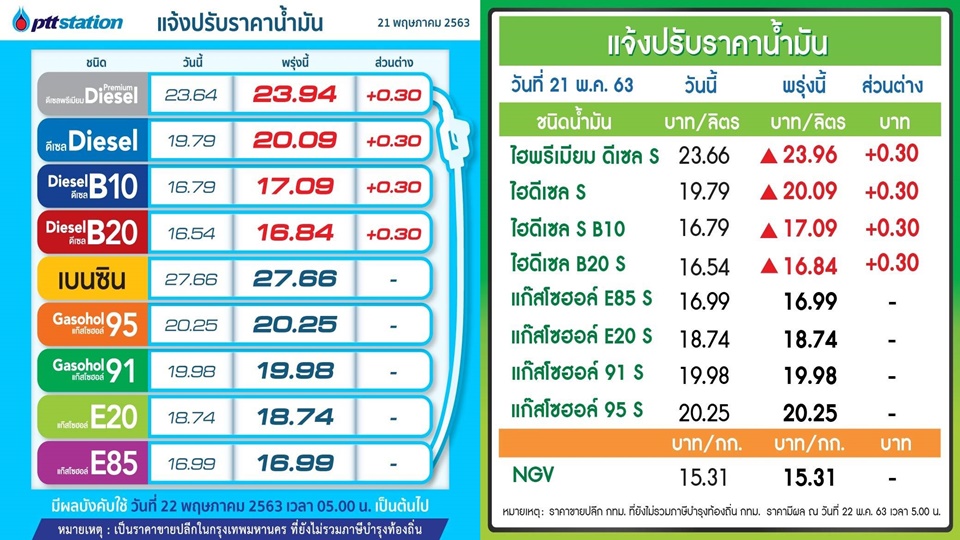บางจากฯ – PTT Station ปรับราคาขายปลีกน้ำมันกลุ่มดีเซลทุกชนิดเพิ่มขึ้น 30 สตางค์ต่อลิตร ส่วนกลุ่มเบนซินและแก๊สโซฮอลล์คงเดิม มีผล 22 พฤษภาคม 2563 เวลา 05.00 น. เป็นต้นไป โดยราคาขายปลีกจะเป็นดังนี้ เบนซิน 27.66 บาท แก๊สโซฮอล์ 95 ลิตรละ 20.25 บาท E20 ลิตรละ 18.74 บาท แก๊สโซฮอล์ 91 ลิตรละ 19.98 บาท E85 ลิตรละ 16.99 บาท ดีเซล 20.09 บาท B10 ลิตรละ 17.09 บาท B20 ลิตรละ 16.84 บาท และดีเซลพรีเมี่ยม 23.94 บาทต่อลิตร โดยราคาขายปลีกข้างต้นยังไม่รวมภาษีบำรุงกรุงเทพมหานคร.-สำนักข่าวไทย