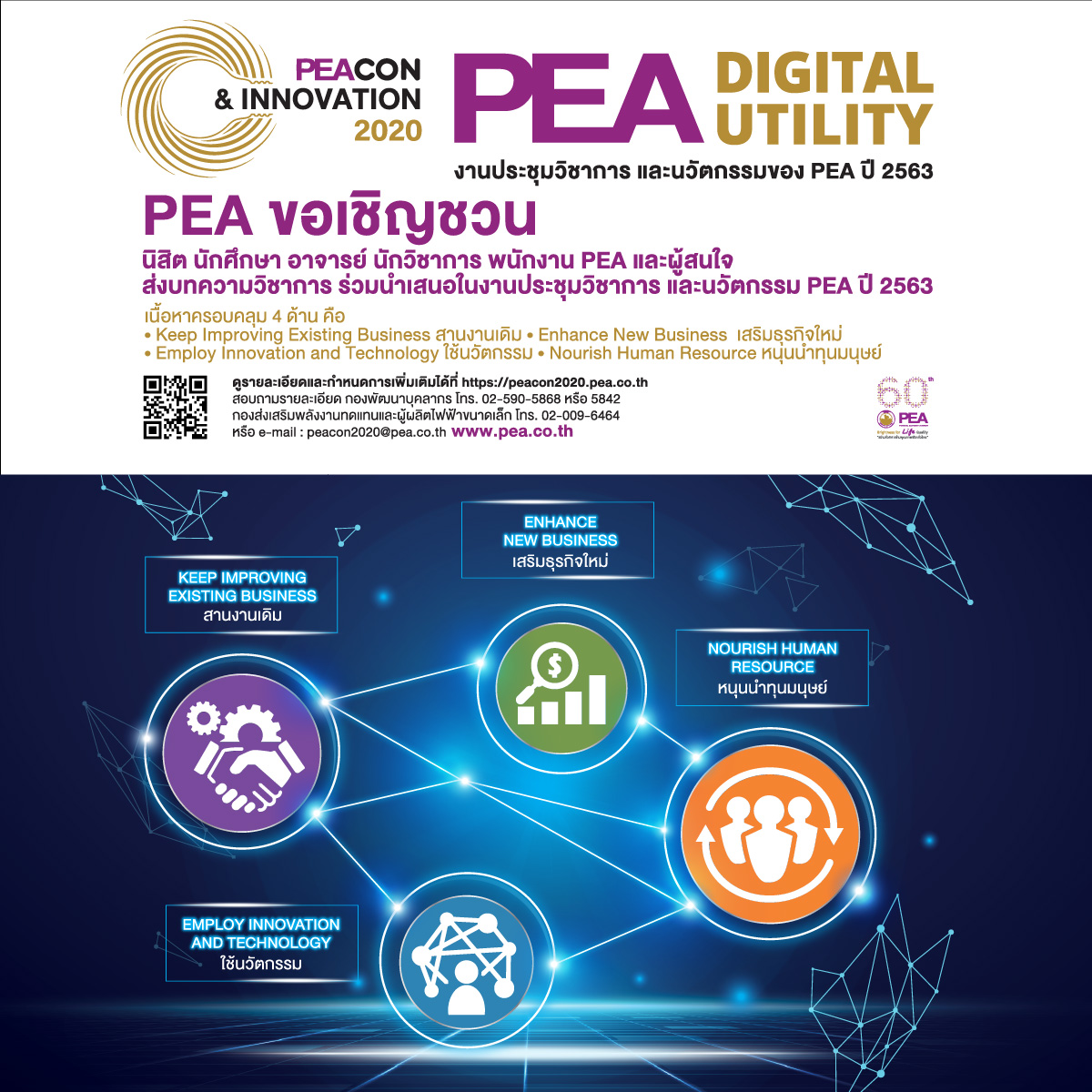 PEA ได้ร่วมกับสถาบันการศึกษาชั้นนำในประเทศและหน่วยงานวิจัยทั้งภาครัฐและเอกชน พร้อมเป็นกำลังสำคัญในการส่งเสริมการศึกษาและงานวิจัยด้านการพัฒนาธุรกิจพลังงานไฟฟ้า เพื่อสร้างนวัตกรรมที่เกี่ยวข้อง เป็นการยกระดับการไฟฟ้าให้ก้าวสู่การเป็นการไฟฟ้าแห่งอนาคต โดยได้ร่วมมือกันดำเนินการจัดงานประชุมวิชาการและนวัตกรรมของ กฟภ. ปี 2563 (PEACON & Innovation 2020) เพื่อเป็นเวทีสำคัญให้ นิสิต นักศึกษา อาจารย์ และนักวิชาการ รวมทั้งพนักงาน PEA ที่มีความรู้ความสามารถ ได้มีโอกาสนำเสนอบทความทางวิชาการ รวมทั้งยังเป็นเวทีแลกเปลี่ยนความรู้ เพื่อนำมาประยุกต์ใช้กับการพัฒนา ด้านธุรกิจพลังงานไฟฟ้าในอนาคตต่อไป