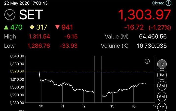 กรุงเทพฯ 22 พ.ค. – ตลาดหลักทรัพย์ปิดวันนี้ที่ระดับ 1,303.97 จุด ลดลง 16.72 จุด (-1.27%) มูลค่าการซื้อขาย 64,469.56 ล้านบาท